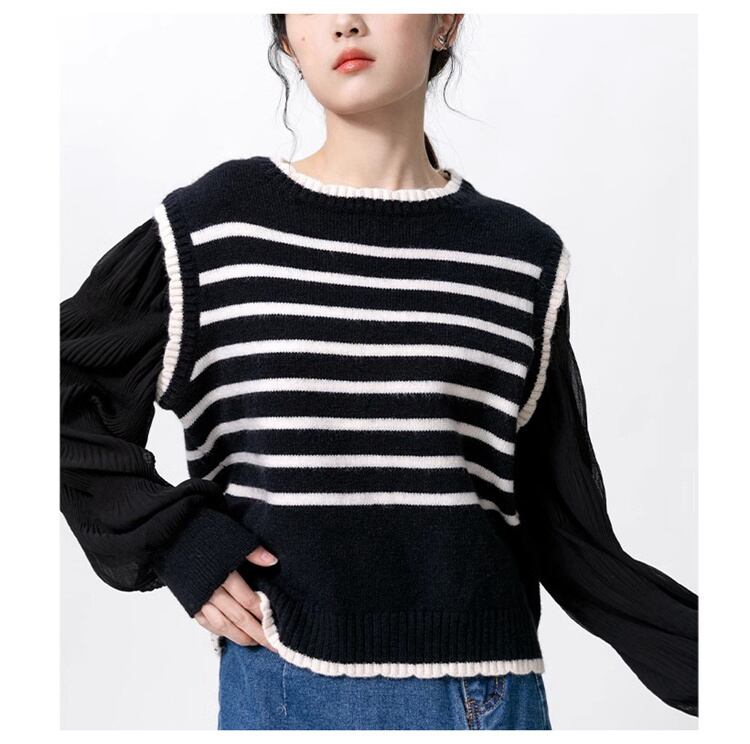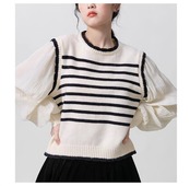 ボーダー カーディガン セーター 長袖 フェイク2ピース 大人気 ニットトップス 2色 フリーサイズ
