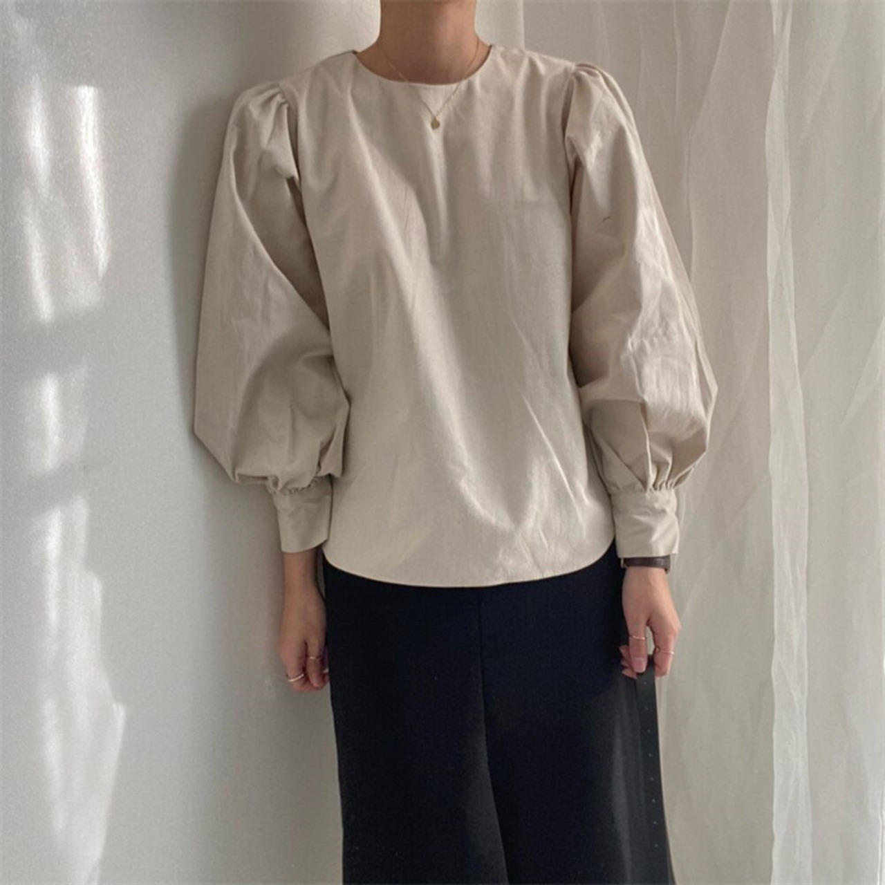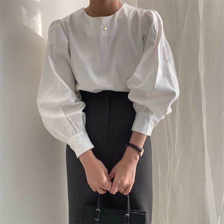 おしゃれな ラウンドネック シンプル パフスリーブ シャツ 2色 フリーサイズ