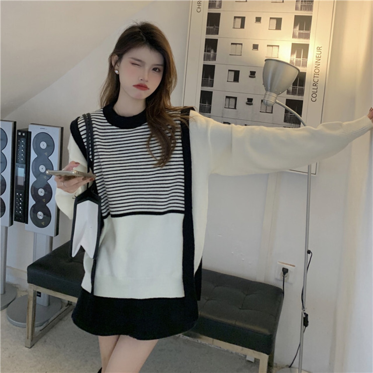 フェイク2ピース ニット トップス レディース 秋 ゆったりする 中・長セクション セーター 1色 フリーサイズ